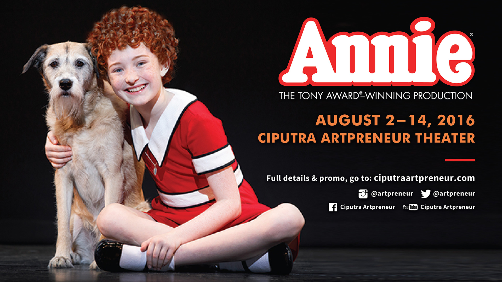 Ciputra Artpreneur is proud to present ANNIE, the world famous Broadway musical, in a brand new physical incarnation of the iconic Tony Award®-winning original. The revamped classical will be playing at Ciputra Artpreneur Theater from 2 - 14 August 2016 in 16 performances.