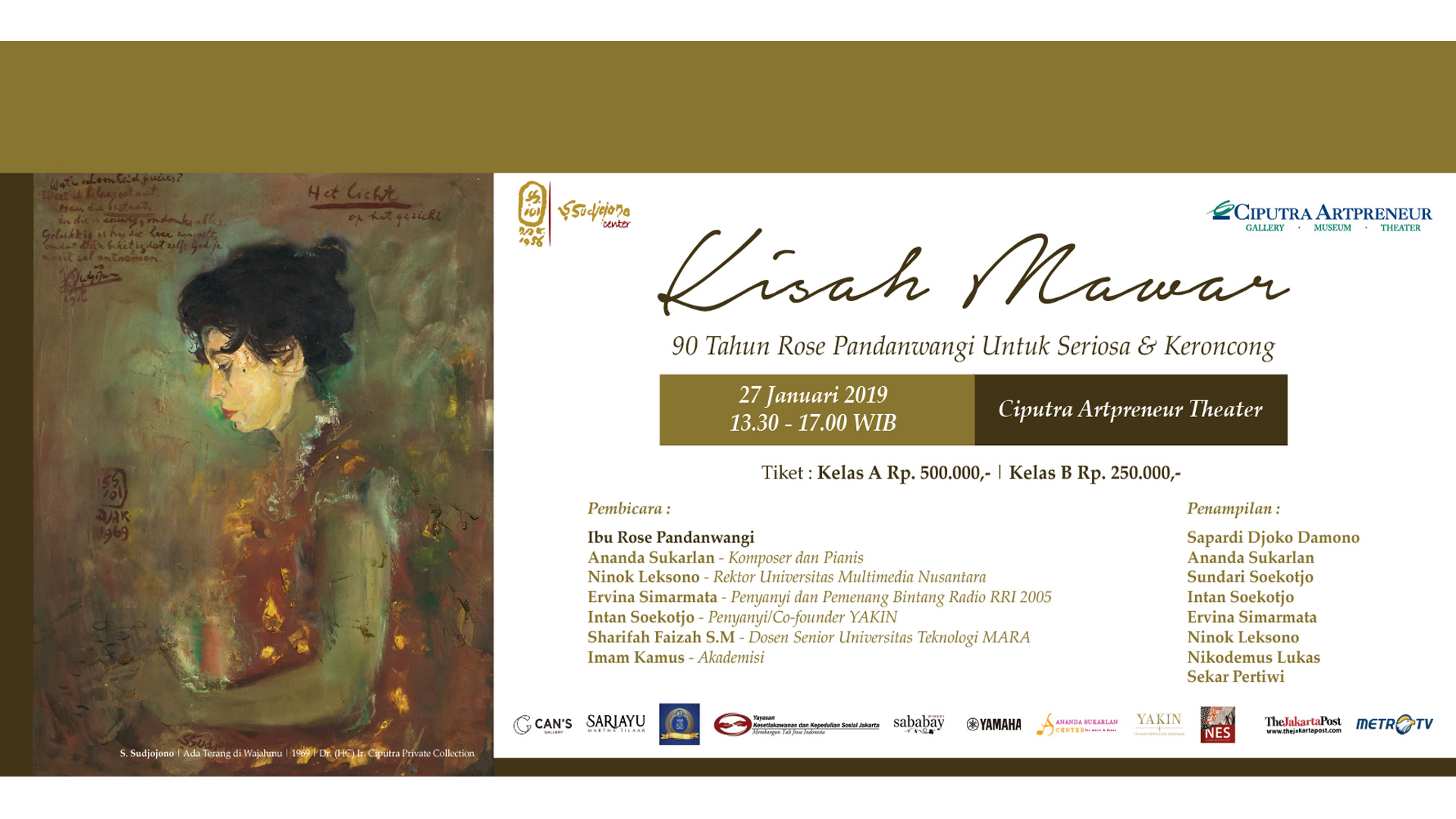 Through this event, the S. Sudjojono Center aims to educate and preserve seriosa and keroncong music, which is an original Indonesian music, to the Indonesian society especially to the younger generation. The event revolves around a Talk Show, about the growth of keroncong and seriosa music genre, with well-known speakers such as Rose Pandanwangi, Ananda Sukarlan, Intan Soekotjo (daughter of Indonesian keroncong maestro Sundari Soekotjo & Co-Founder of Keroncong Indonesia Foundation), Ninok Leksono (Rector of Multimedia Nusantara University), Sharifah Faizah Syed Mohammed (Senior Lecture at Universiti Teknologi MARA Malaysia), Imam D. Kamus (Academician and Founder of Sarekat Krontjong and Dawai Nusantara).